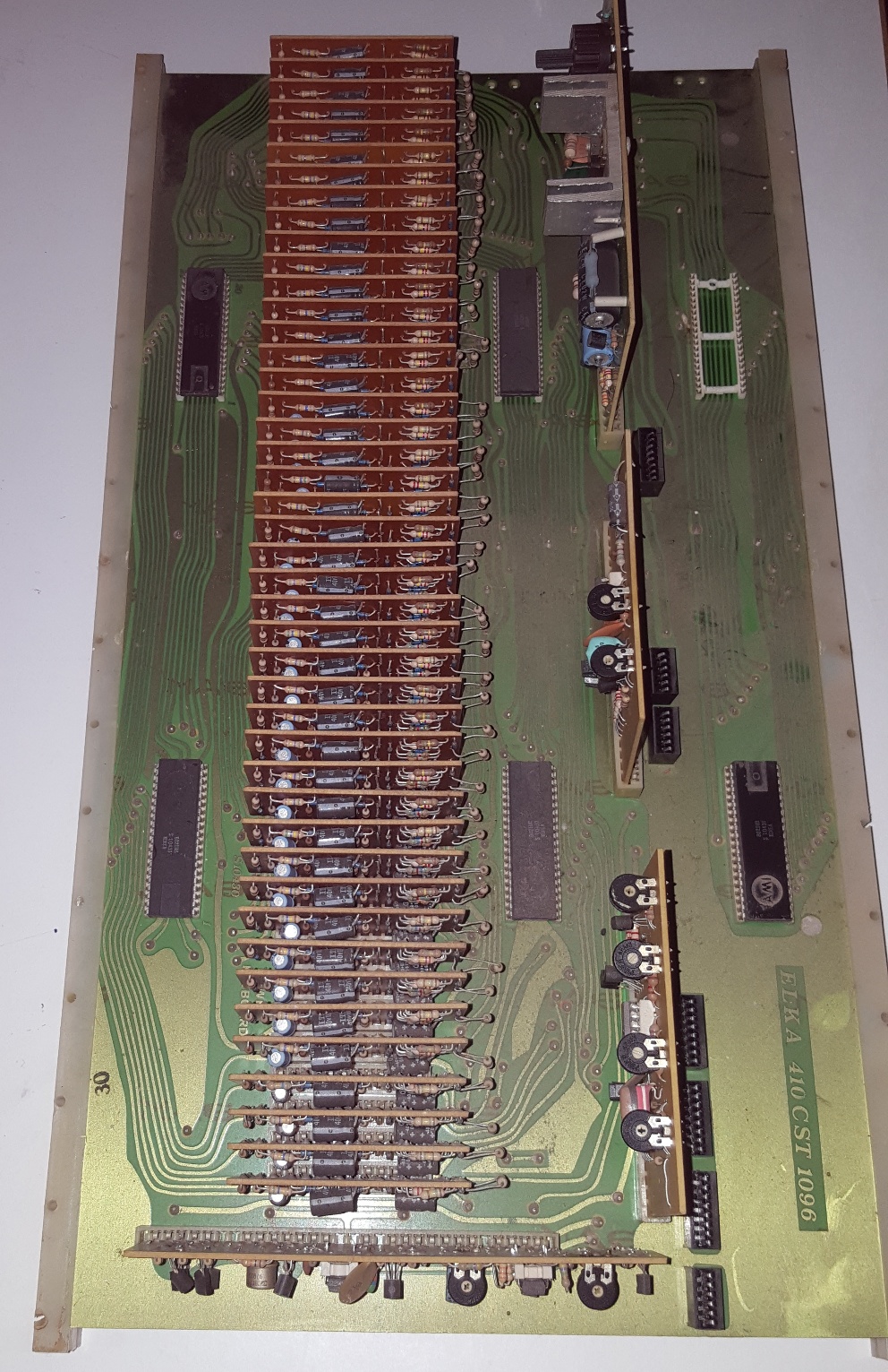 The lower main board has a processor and FPGA to generate every note and every key individually. The key voltages are generated using a 12-bit DAC (4,096 different voltages) and the note outputs are generated by the FPGA. Every possible combination is thus possible to generate.