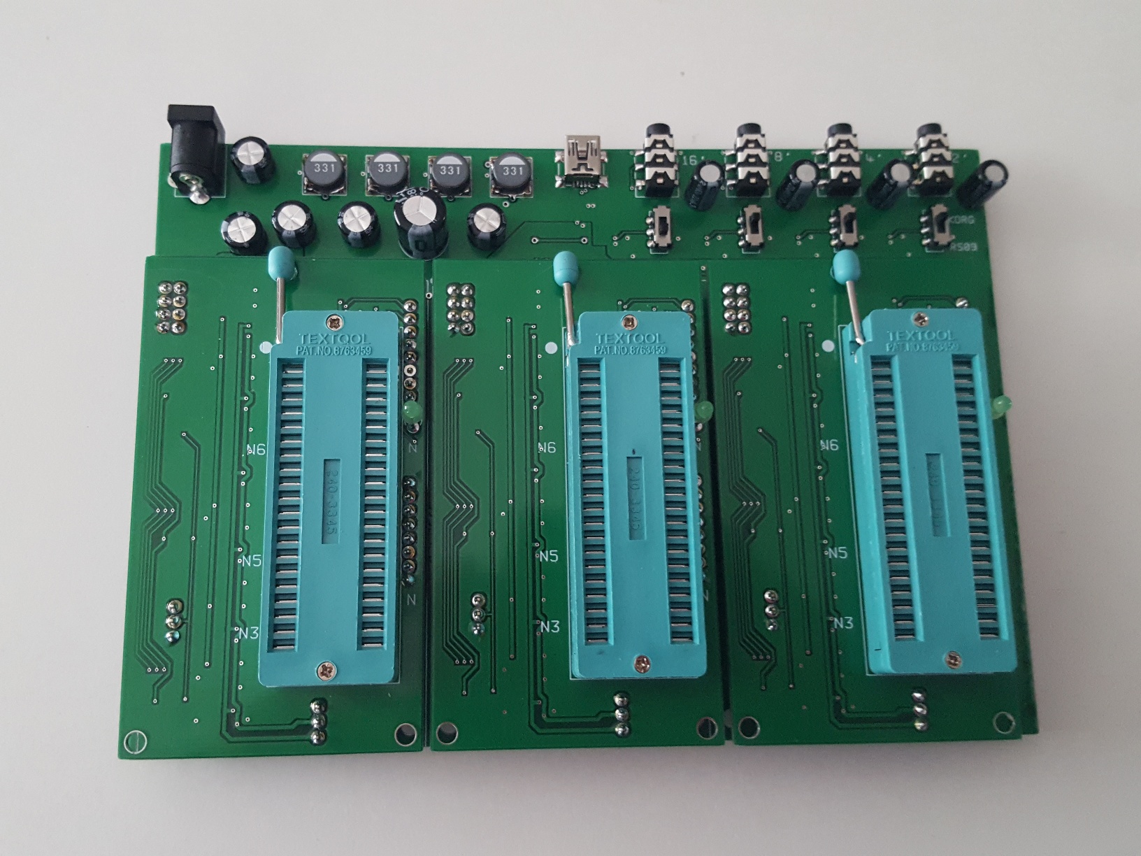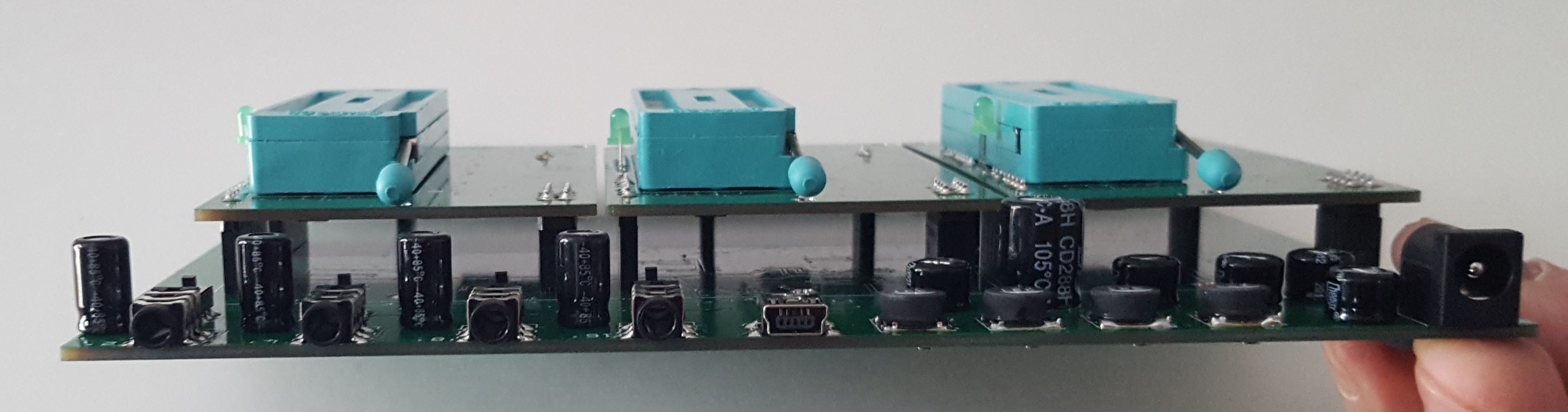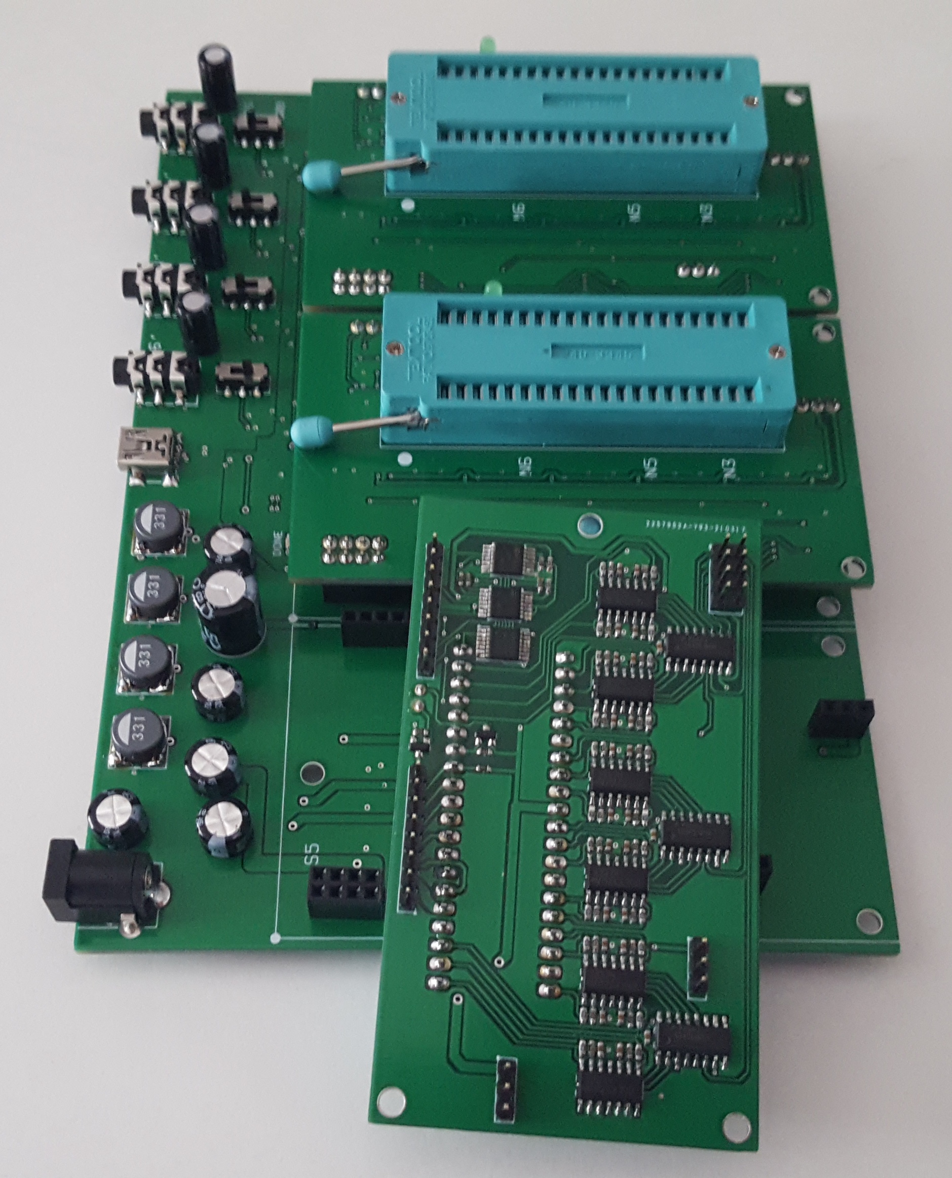 The three top layer plug-in boards are all identical and are for plugging in the devices under test.