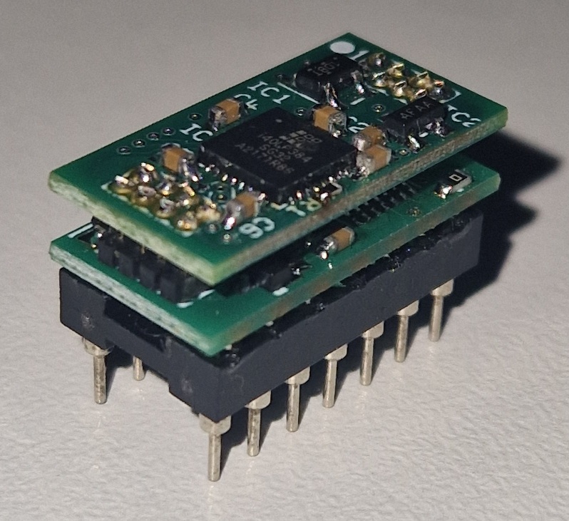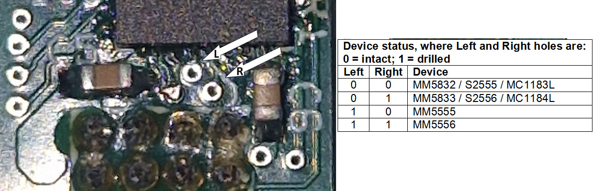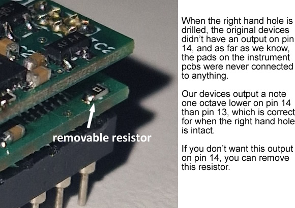 Single devices can now be used for either 5832/5833 or 5555/5556. By drilling out combinations of the two plated holes, the output notes change to suit. So it is possible to buy two of the same and modify as required. Note that you will need a 0.8mm PCB drill. You can also remove the resistor indicated to prevent output on pin 14. See instructions in this pdf file .